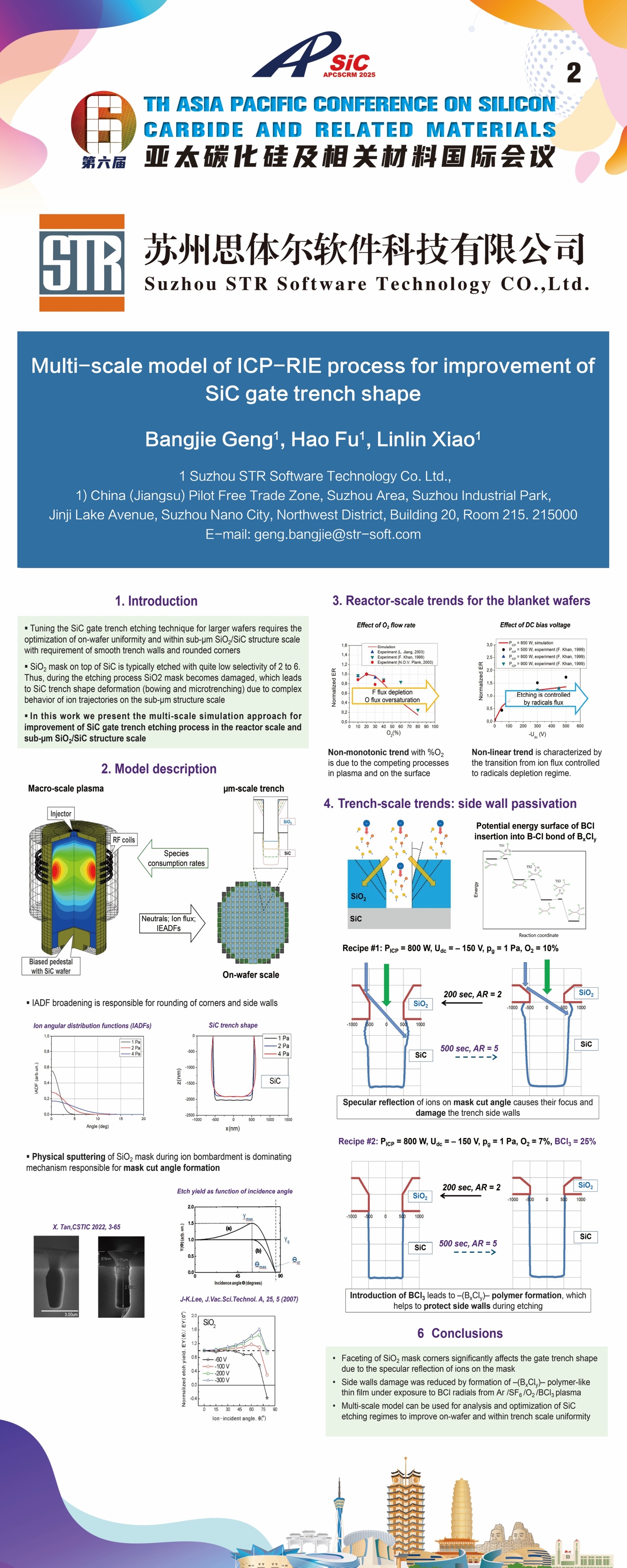 其中我司还进行了会议POSTER投稿。编号2的POSTER展示了新的刻蚀工艺的改进方案。在大尺寸SiC晶圆上的刻蚀技术需要优化晶圆表面的刻蚀均匀性,同时在亚微米级尺度内要求光滑的沟槽壁面和圆角。另外,在刻蚀过程中,由于离子在亚微米尺度上的复杂行为,SiO2掩膜被破坏,导致SiC沟槽形状变形。根据上述提到的刻蚀工艺中存在的问题,POSTER详细展示了在反应器尺度和亚微米尺度上的多尺度模拟仿真方法以改进SiC栅极沟槽刻蚀工艺。