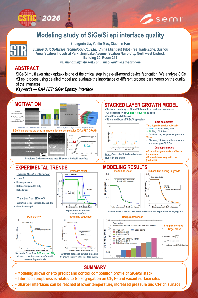 本次我司海报主要展示了针对SiGe/Si多层堆叠外延界面质量的建模研究,SiGe/Si多层堆叠外延是环绕栅极(GAA)等先进半导体器件的核心工艺步骤,其界面质量直接决定了器件的性能。目前SiGe/Si外延界面存在明显的锗偏析(锗掺入相邻的Si外延层中)导致界面模糊的问题。